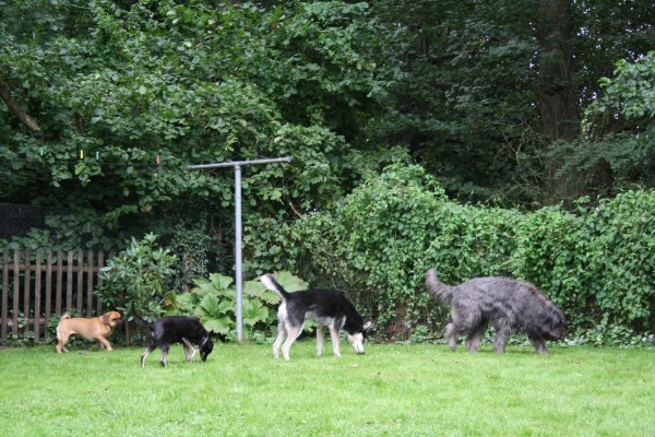 Ab wann ist ein Garten ein großer Garten? Wir möchten ungern eine bestimmte Mindestgröße vorgeben. In einem großen Garten könnte auch ein großer Hund ein Stück rennen, es gibt viele Schnüffelecken und vielleicht umgibt er sogar das ganze Haus? Nett gestaltete Hundeplätze sind für uns große Gärten oder Hundeauslaufgrundstücke. Ein großer Garten ist auch dann für den Hund interessant, wenn er nicht durch "enriched environment" (noch) abwechslungsreicher gestaltet wurde.